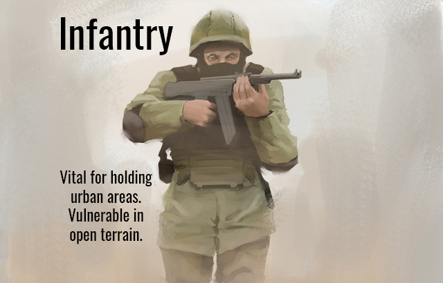 Warlords: Global Annihilation features a multitude of land, sea and air units that move at real-world speeds and are affected by real-world terrain. Infantry excel in close range when protected by cover provided by forests, cities or fortifications, but tanks and other armoured vehicles dominate open spaces. Aircraft and naval vessels will battle for control of air and sea.